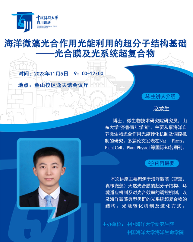 研究生百川讲坛 | 第265讲 赵龙生:海洋微藻光合作用光能利用的超分子结构基础——光合膜及光系统超复合物