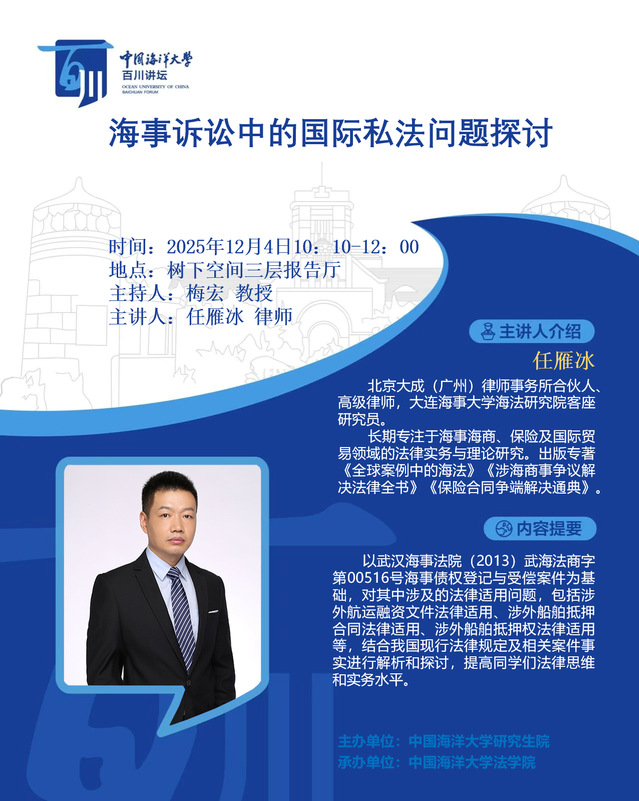 研究生百川讲坛 | 第575讲 任雁冰:海事诉讼中的国际私法问题探讨