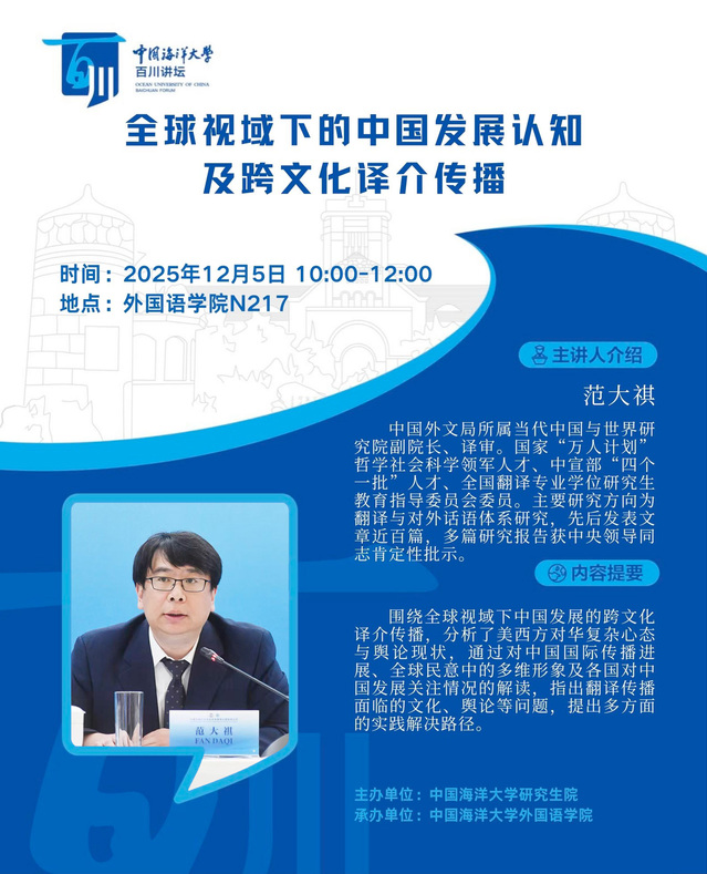 研究生百川讲坛 | 第576讲 范大祺:全球视域下的中国发展认知及跨文化译介传播