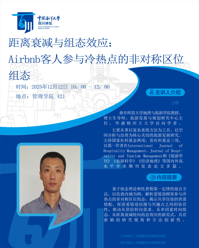 研究生百川讲坛 | 第582讲 王铁:距离衰减与组态效应:Airbnb客人参与冷热点的非对称区位组态